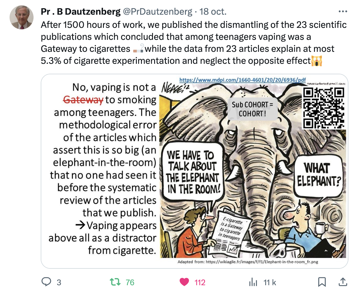 Il y a quelques jours, le Pr Dautzenberg et le Dr Arvers avec d’autres co-auteurs ont publié une analyse des études qui prétendent démontrer un effet passerelle de la vape au tabac chez les jeunes. Leurs conclusions sont sans appel, les erreurs commises dans les analyses des données et leurs interprétations farfelues sont comparées par les chercheurs à un éléphant dans un couloir. En résumé, l’effet passerelle est insignifiant, c’est un mythe, c’est faux. Lire ici : Systematic Review and Critical Analysis of Longitudinal Studies Assessing Effect of E-Cigarettes on Cigarette Initiation among Adolescent Never-Smokers.