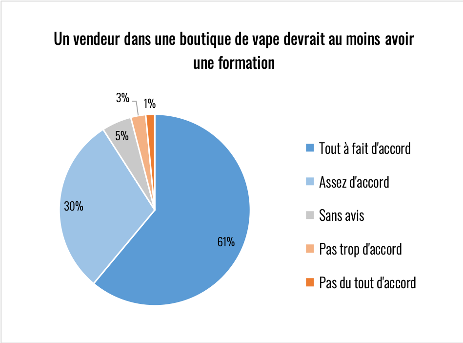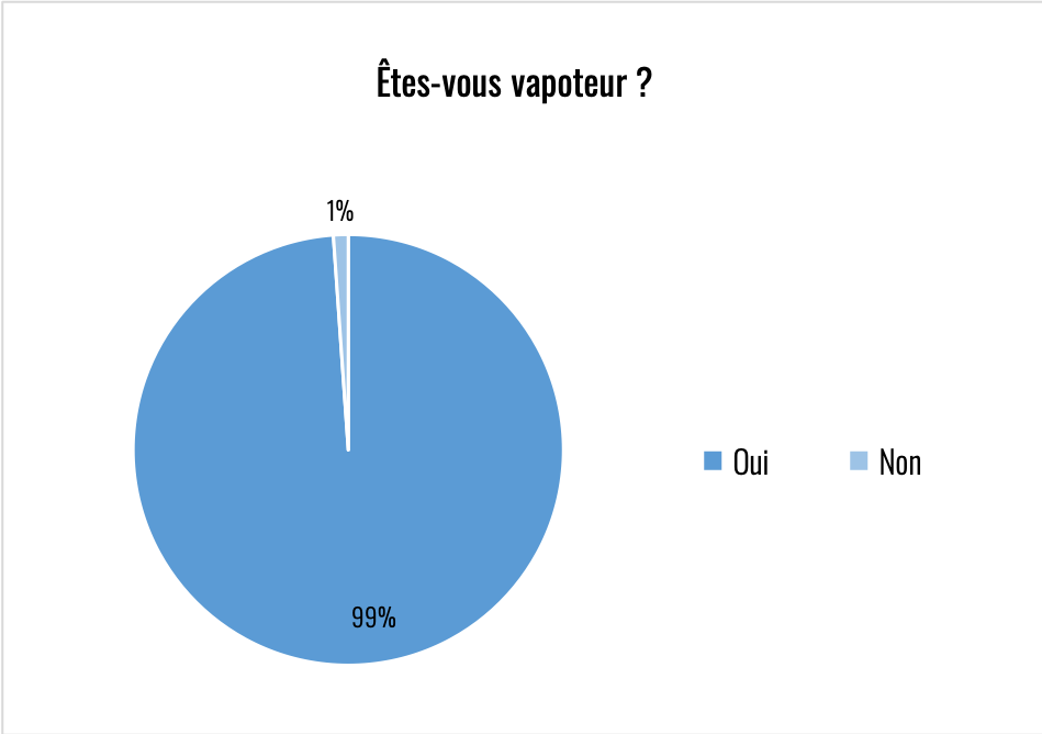 Les trois questions en introduction ont permis d’établir le profil des personnes qui ont répondu. Sans surprise vu les canaux de diffusion, les répondants sont essentiellement des vapoteurs à 99%.