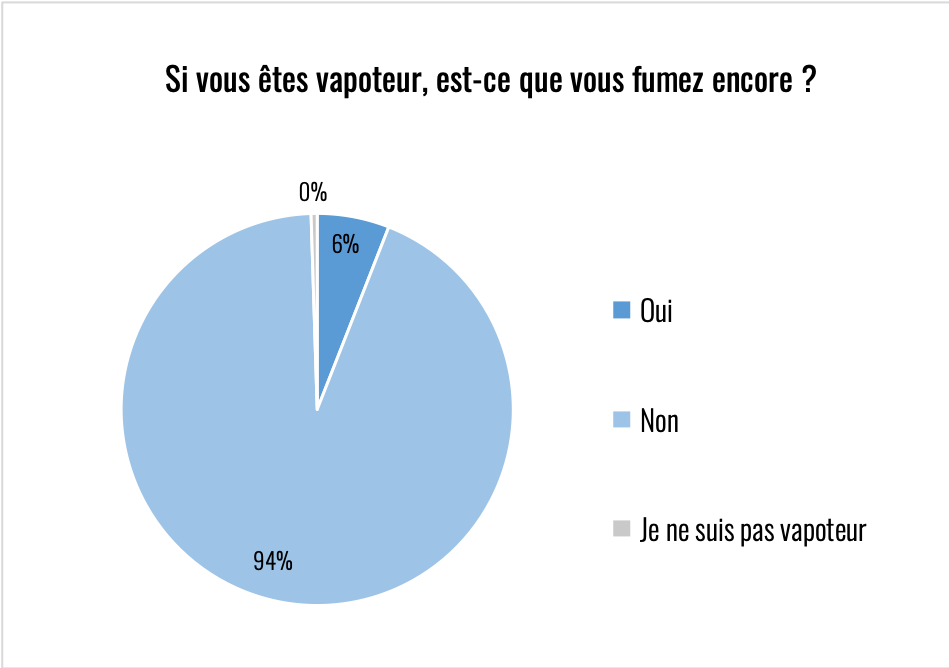 Par ailleurs, ils sont 94% à ne plus être fumeurs. Cela ne correspond pas aux chiffres connus en population sur la répartition entre vapoteurs exclusifs et vapofumeurs. Cela caractérise bien le profil des répondants. C’est à nouveau logique avec les canaux de diffusion du questionnaire, nous avons à faire à des vapoteurs expérimentés pour qui la vape a été un outil efficace pour arrêter de fumer.