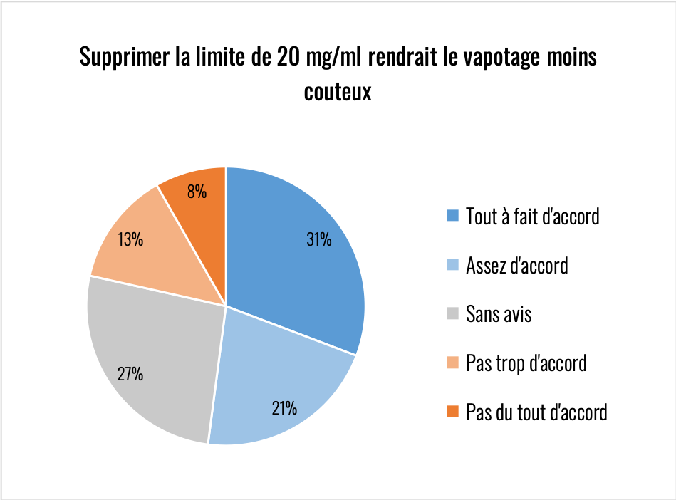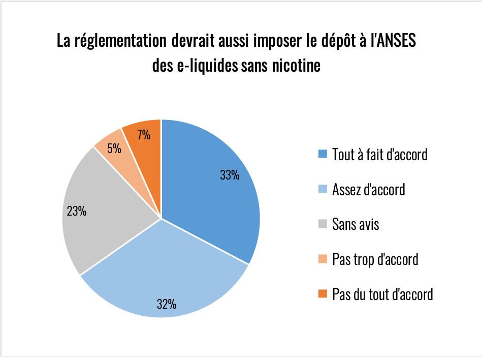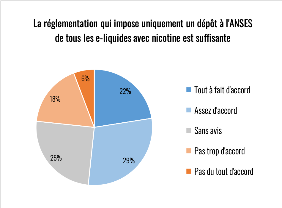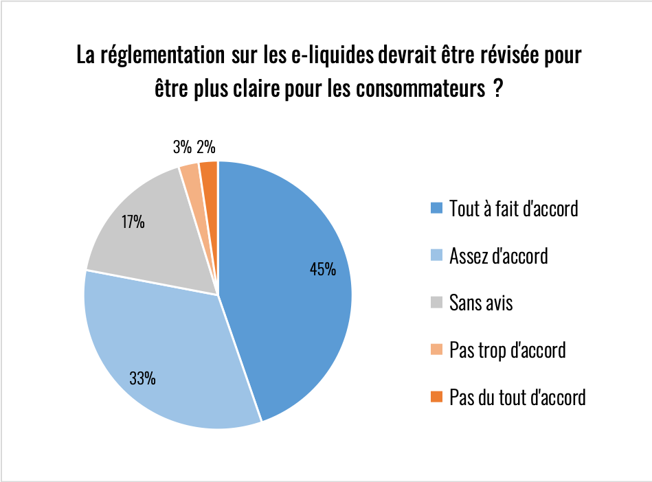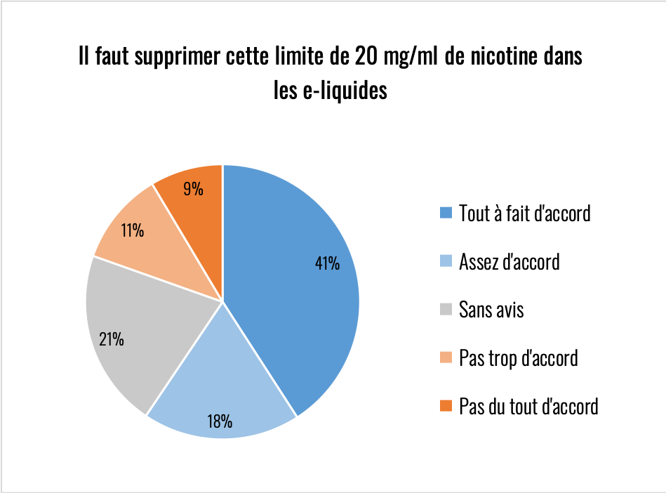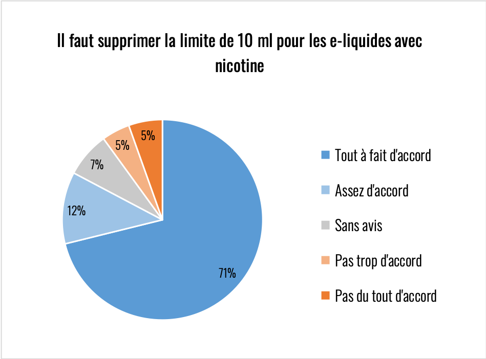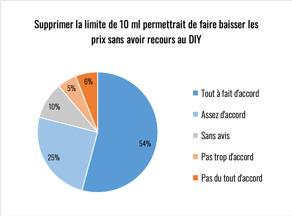 NOTA : je regrette d’avoir oublié de poser une question sur l’environnement car cette réglementation à un impact désastreux sur la consommation de plastique, que ce soit en nombre de flacons et surtout en nombre de bouchons. Autoriser des flaconnages à 50 ml permettrait déjà de diviser par deux la quantité de plastiques souillés et difficilement recyclables à cause de la nicotine.