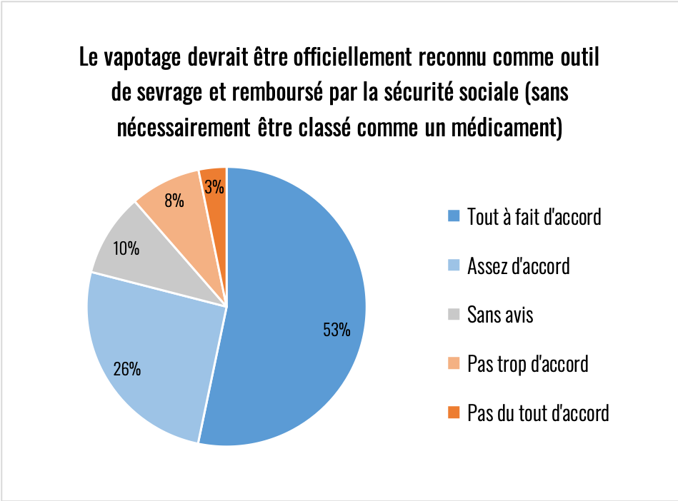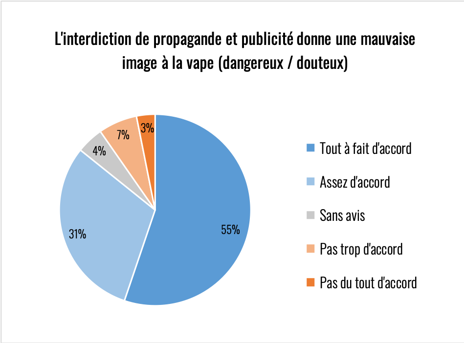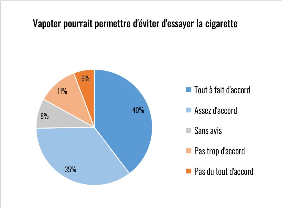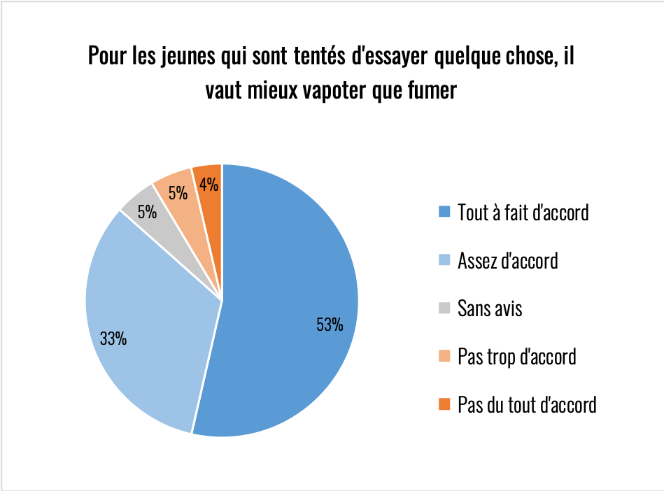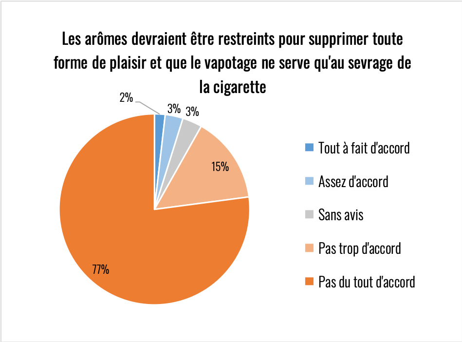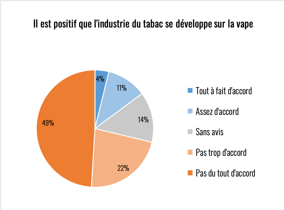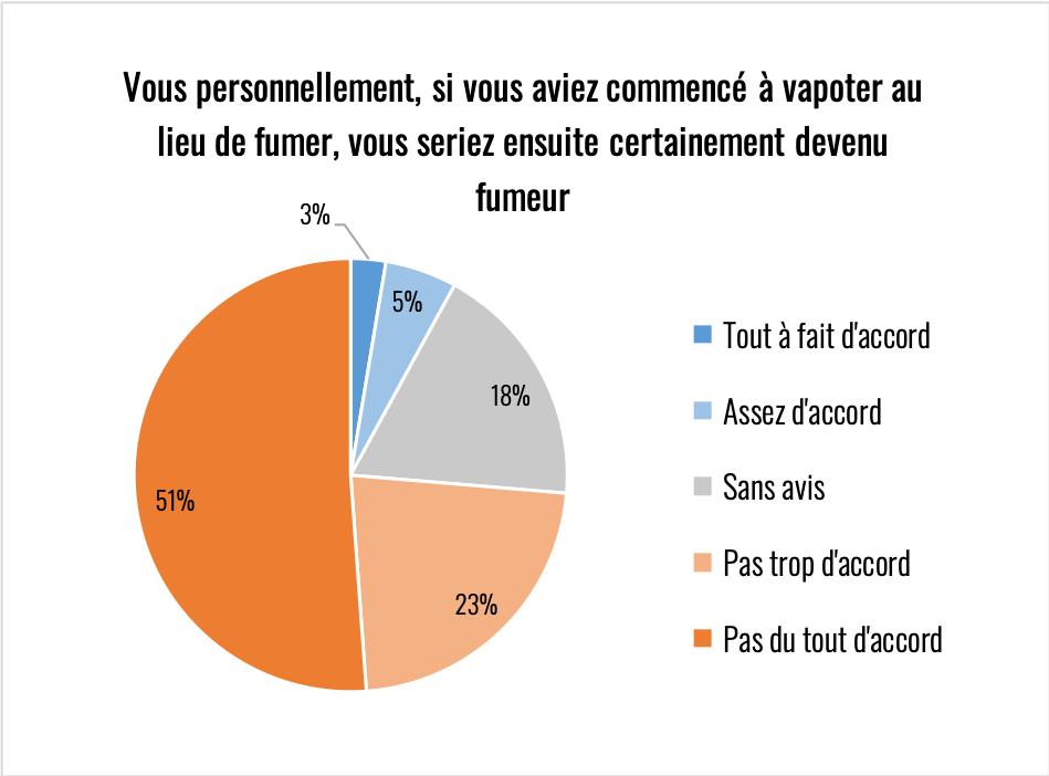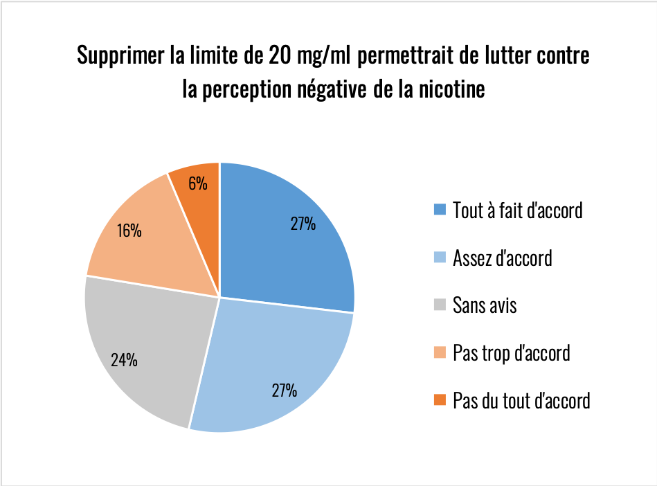 Élément remarquable sur toutes les réponses de cette partie du questionnaire, il y a toujours au moins 20% d’indécis. La question de la nicotine reste donc encore assez floue y compris chez des consommateurs experts. Le climat anxiogène qui l’entoure est très problématique compte tenu de son rôle primordial dans l’aide à l’arrêt de la cigarette.