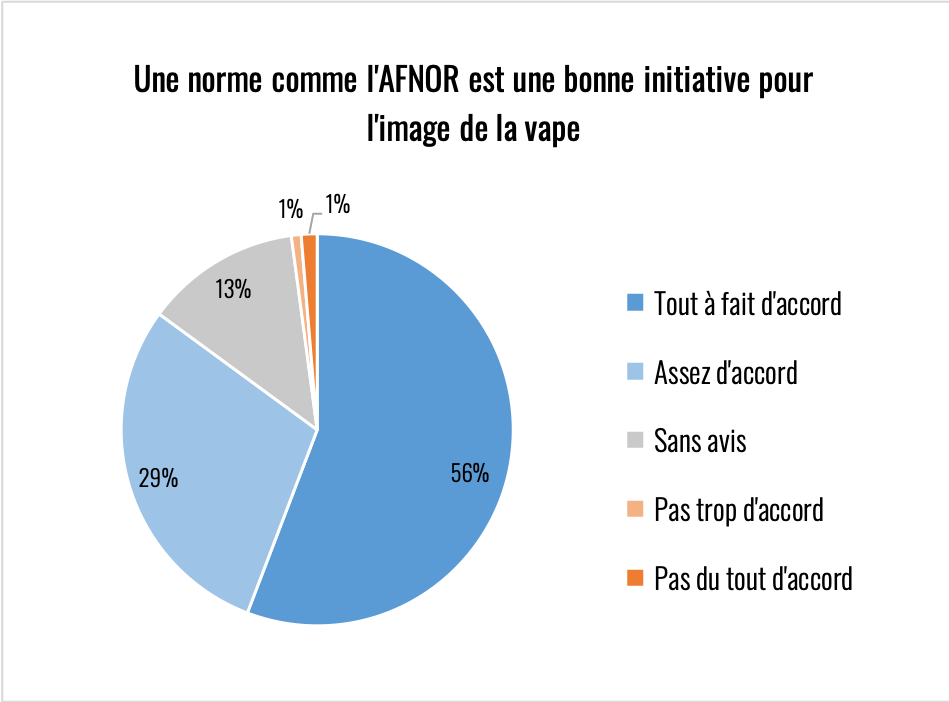 Il y a de nombreux débats entre fabricants et commerçants autour de la norme AFNOR, sur sa pertinence, sa valeur, son utilité et son coût pour les professionnels. Pour ma part, je travaille pour de nombreux domaines d’activité BtoB ou BtoC, j’entends toujours les mêmes arguments (valables et légitimes) chez les pro et les anti-normes. Quoi qu’on en dise, pour les vapoteurs qui ont répondu à ce questionnaire, la démarche est largement plébiscitée.