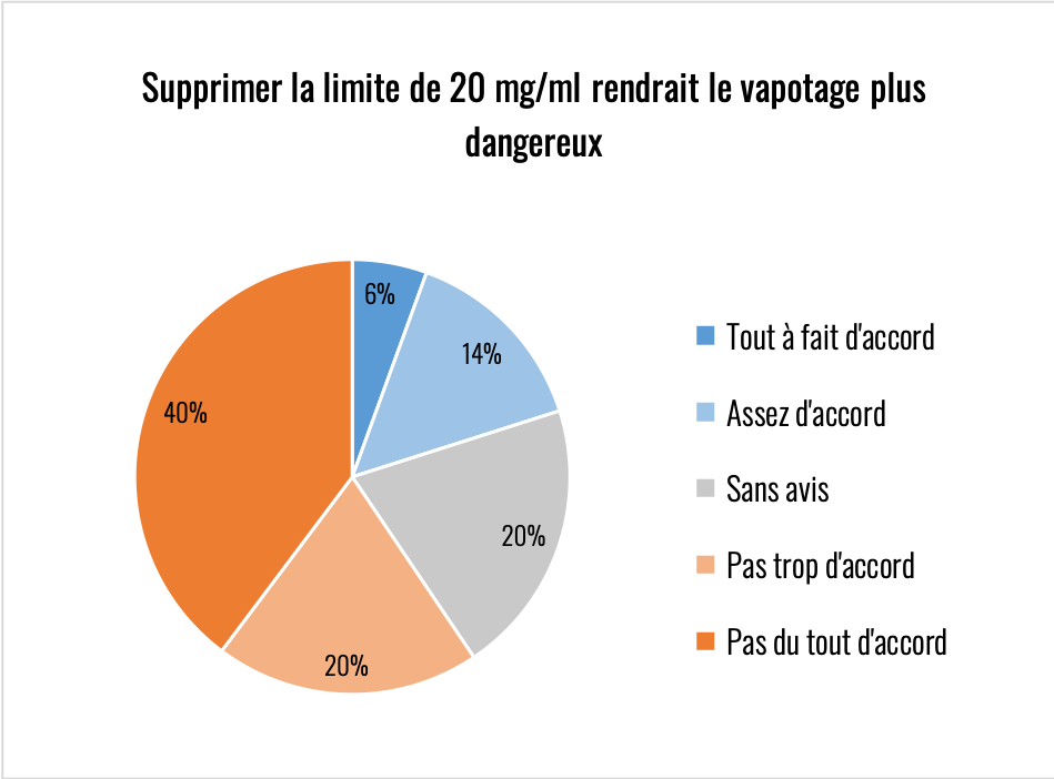 Comme pour les flacons à 10 ml, une grande majorité des vapoteurs experts estiment qu’il faudrait supprimer la limitation à 20 mg/ml. À savoir qu’au-delà du besoin en nicotine pour certains fumeurs pour qui un dosage plus fort serait indiqué, le fait de relever le taux rendrait le 20 beaucoup moins « anxiogène ». En effet, de nombreux débutants, surtout s’ils sont mal conseillés, démarrent à 6 voir à 3 simplement parce que le « maxi » leur fait peur.